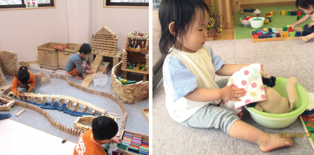 0~2歳児 星の子の0~2歳の保育は、一人ひとりを大切にする、集団ではない保育・生活の環境が特徴です。朝起きる時間もお腹の空く時間も一人ひとり異なる子どもたち。生れて最初の3年はお家と同じように、子どものリズムに合わせたやさしい環境の中で生活していきます。一人ひとりの24 時間の生活リズムをご家庭と共有した上で、食事・トイレ・お昼寝を一人ひとりの子どもにとってちょうど良い時間を探し、保育者が1対1や少人数で、丁寧にあたたかく関わります。 また育児担当制をベースに、食事・トイレ・着替えなどの育児に関することは、いつも同じ保育者が同じ方法で関わり、子どもにとって安心して見通しを持てる環境で子どもを支え、「自立・自律」の芽を大切に育んでいきます。